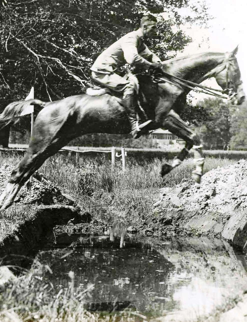| Generaal Jan Portheine was van 1929 tot 1968 bestuurslid van de KMSV en het KMSV-Fonds. Hier als luitenant boven een waterhindernis tijdens het Internationaal Kampioenschap Rijpaarden 1925 op Landgoed Beukenburg bij Hilversum (foto: Cavaleriemuseum) |