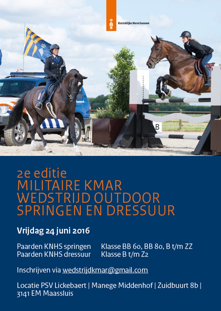 Op vrijdag 24 juni 2016 organiseert de wedstrijdcommissie van de Koninklijke Marechaussee opnieuw een militaire outdoorwedstrijd onder auspiciën van de Militaire Ruitersportvereniging 'Te Paard!', conform de KNHS-reglementen.