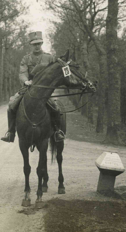 | Luitenant Reinaldus van Rijckevorsel leest de kaart vanaf de rug van zijn paard bij een paddenstoel van de ANWB tijdens de Rallye-paper van Apeldoorn, die in mei 1933 startte vanaf Paleis het Loo |