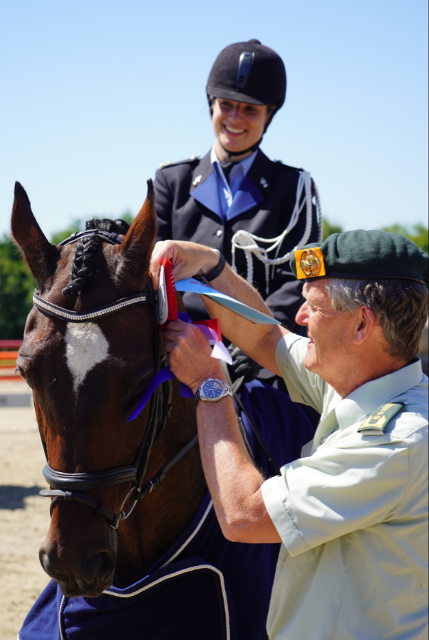 Generaal Hans van der Louw reikt de eerste prijs uit aan luitenant Kristel Franse en Watson voor hun prestatie in dressuur klasse Z1