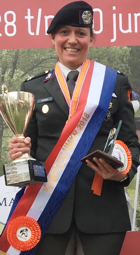 | De Nationaal Militair Kampioen Eventing 2018: wachtmeester Anica Kortekaas, die met het jonge paard Godolphin K als eerste van 50 combinaties in klasse M van de Maarsbergen Horse Trials eindigde en voor de vijfde keer dit kampioenschap won (foto: sergeant Emily Sanders) |
