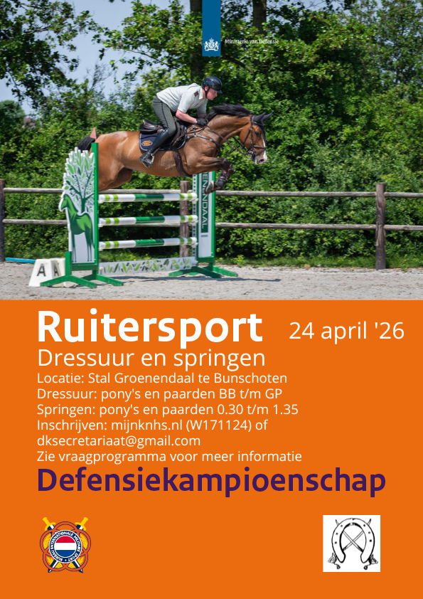 Inschrijven De inschrijving sluit op 18 april. MRV-leden met een KNHS-startpas kunnen zich inschrijven via www.mijnknhs.nl. Voeg dan bij de opmerkingen je rang, wapen of dienstvak en krijgsmachtdeel toe. Combinaties zonder startpas kunnen zich aanmelden via dksecretariaat@gmail.com onder vermelding van naam, paard, klasse en waar van toepassing militaire gegevens.