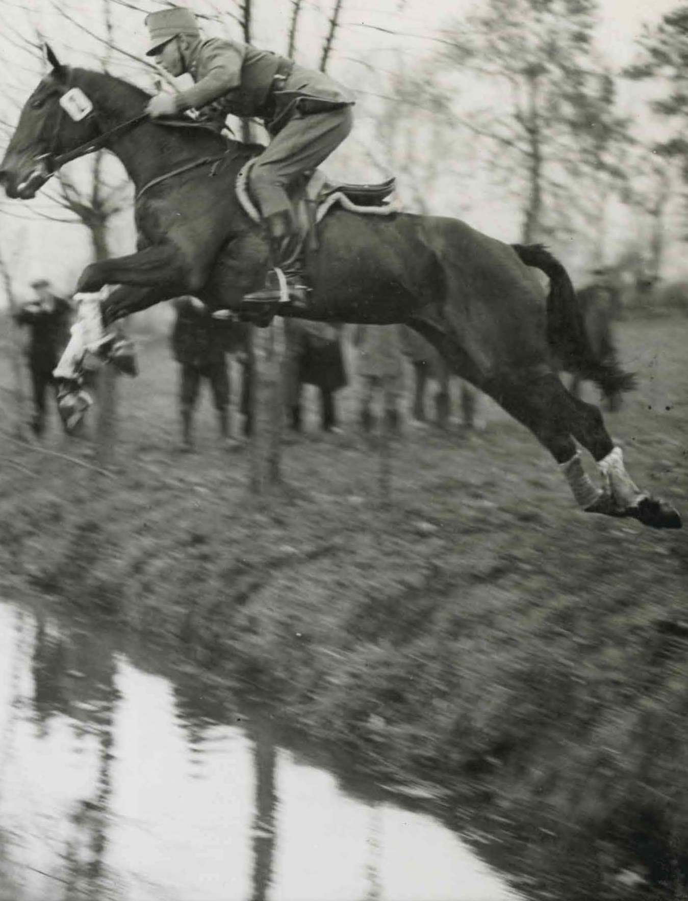 | Luitenant Willem baron van Heeckeren van Kell met het paard Kikker boven de sloot tijdens de Dubbele Cross Country van 1936 van Deventer naar Beekbergen |