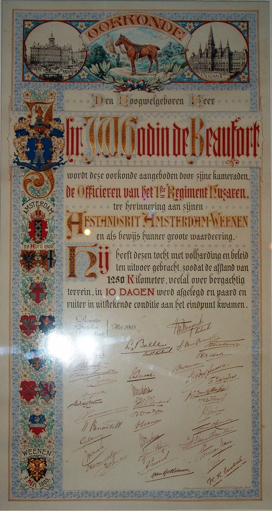 ![]() Ritmeester jhr. Johan Willem Godin de Beaufort, hier als luitenant met het paard Mascotte, waarmee hij in 1903 in slechts tien dagen van Amsterdam naar Wenen reed